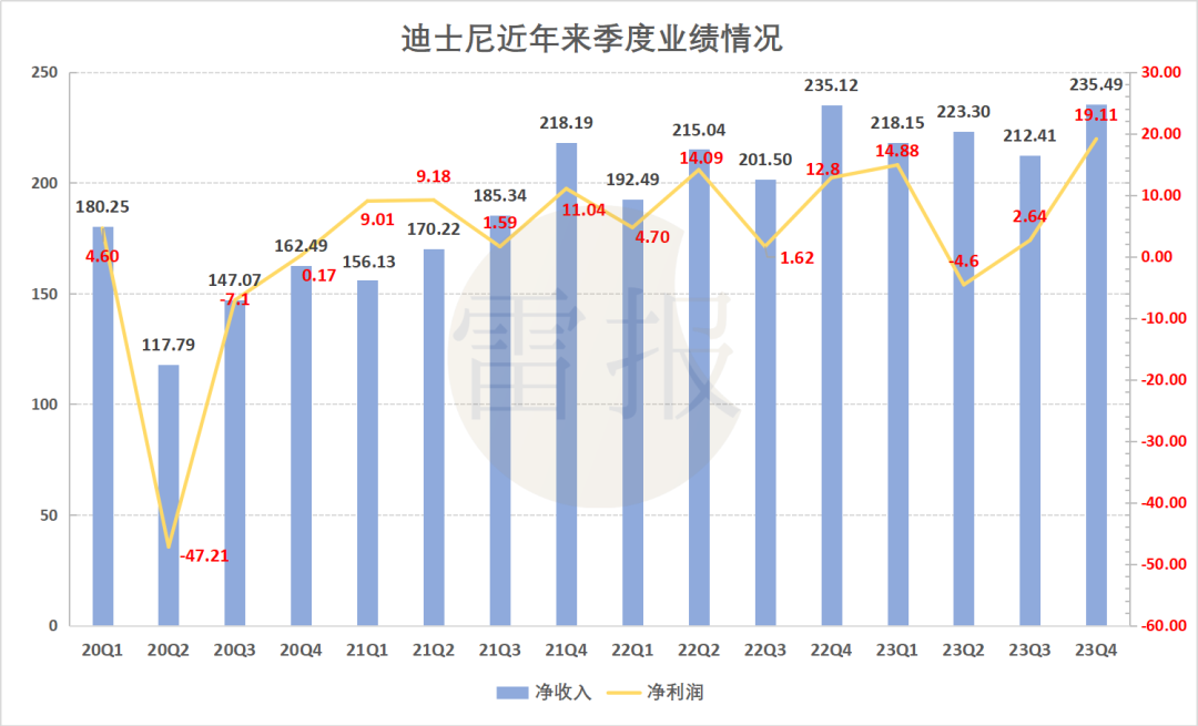 不久前,海外的迪士尼也发布了截至12月30日的2024财年一季报(即自然年2023年第四季度,下文均按自然年表述)。据悉,2023年Q4,迪士尼实现营收235.49亿美元(约合人民币1702亿元),与上一年同期基本持平;净利润19.11亿美元,同比增长49%。主要是主题乐园业务带来的强劲增长。
