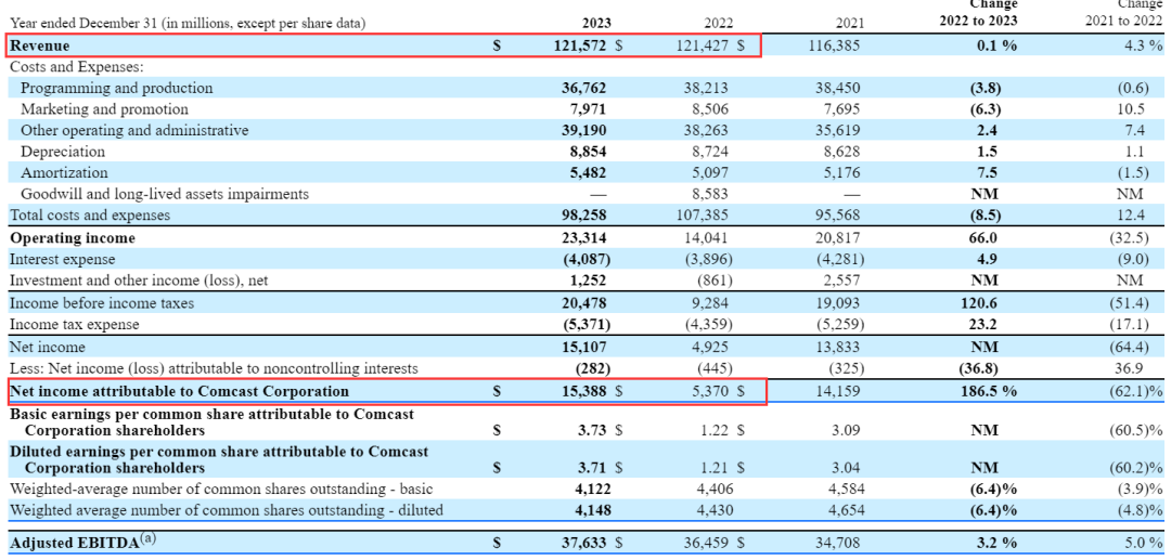 另一边,环球影业母公司康卡斯特披露的截至2023年12月31日的财政年度报告中显示,其2023年全年收入1215.72亿美元(约合人民币8787亿元),与上一年持平;Q4收入为312.53亿美元(约合人民币2259亿元);年度净利润达到153.88亿美元,同比上一年大幅增长186.5 %。据悉,康卡斯特的受益好于预期,是受主题公园和宽带业务的推动。