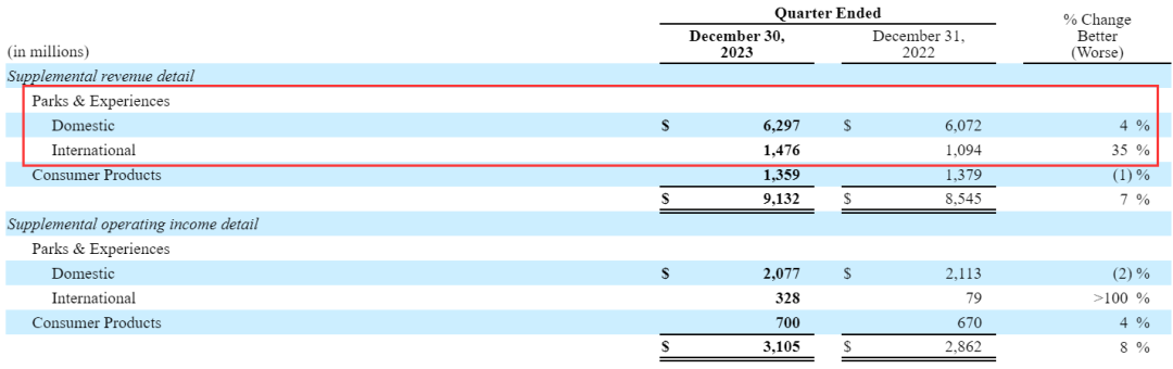 2023年Q4,迪士尼【体验】板块的整体收入增长7%,营业收入同比增长了8%,主要得益于国际乐园和度假村的增长。