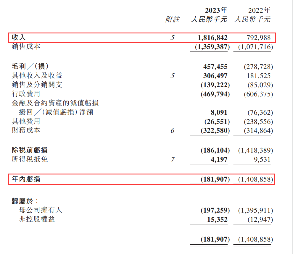 2023年全年,海昌海洋公园收入18.17亿元,相比上一年的7.92亿元增长约129.1%;归属股东净亏损为1.82亿元,相比去年14.09亿元的净亏损,整体亏损都有大幅度的改善。