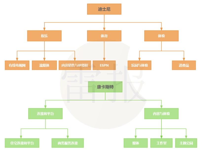 迪士尼和康卡斯特可对标的业务除了占收入大头的有线电视外,主要为“影视内容与授权”以及“主题乐园”两类业务。