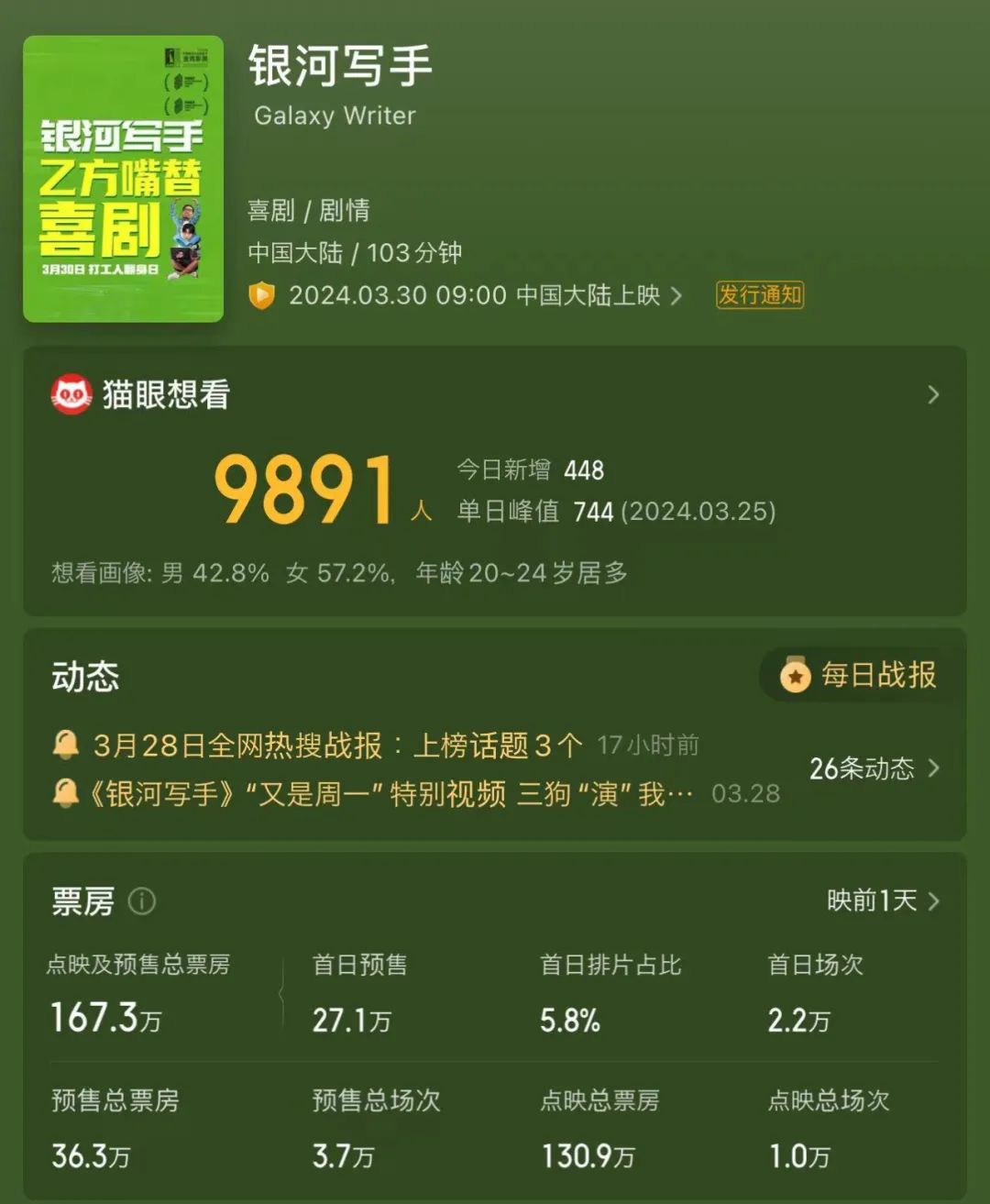 尽管明天才是该片正式公映日,但综合影片点映、预售及映前热度来看,《银河写手》逆风翻盘的概率已经微乎其微。