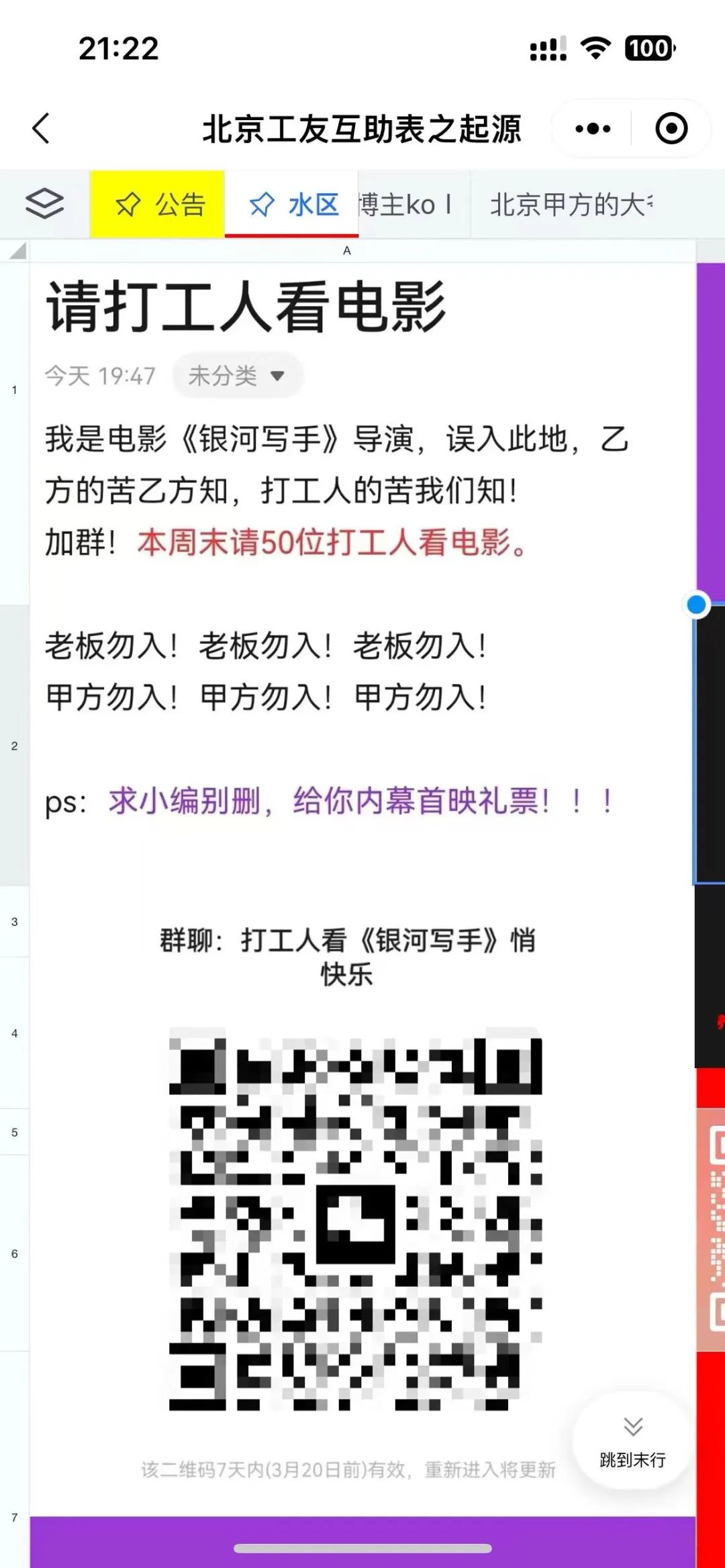 主创们追赶热点的效率也是一流。前两周,在“打工人表格”火热全网之时,《银河写手》导演李阔便在第一时间在表格上发出邀约,邀请一批普通打工人参加点映。在与普通网友交流之余,还广泛征集乙方用语编写推广曲,热点意识强烈。