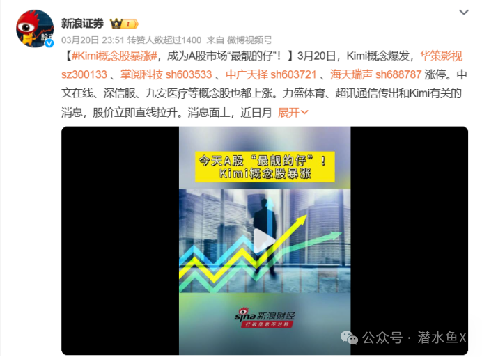 体现一个产品的火热程度,看二级市场反馈最直接。目前在二级市场中,与Kimi有关联的公司已经被视作一个概念板块,名叫“Kimi概念股”。包括华策影视、掌阅科技、中广天择等诸多文娱行业公司也跻身其中。