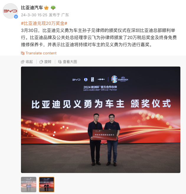 据@比亚迪汽车 消息,3月30日,比亚迪见义勇为车主孙子见律师的颁奖仪式在深圳比亚迪总部举行。比亚迪品牌及公关处总经理李云飞为孙律师颁发了20万税后奖金及终身免费维修保养卡。