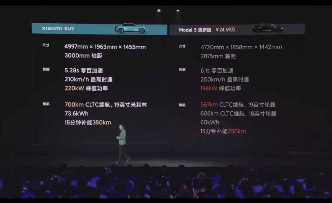 关于二者之间的优劣,每个人都有自己的答案。能够参考到的两个维度是,小米SU7本身是对标Model 3的,再者雷军在发布会上也强调了特斯拉Model 3的强悍。