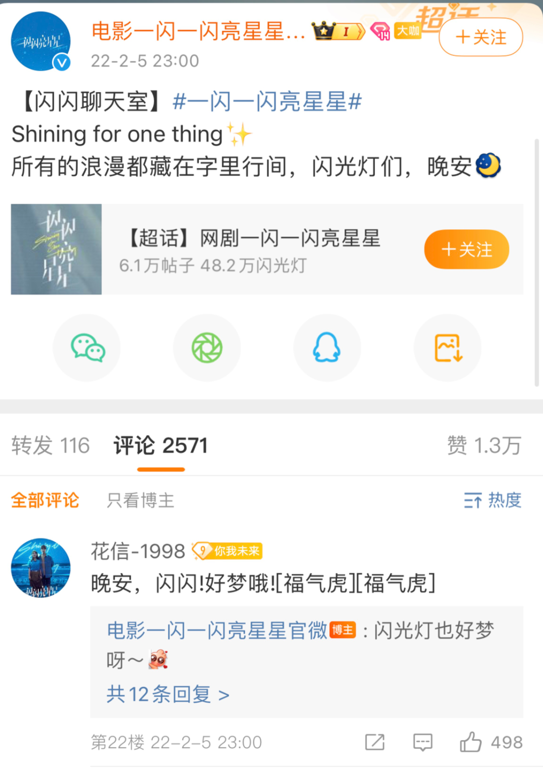 在《一闪一闪亮星星》的宣传中,官微就承担了这样一个角色。除了物料的派送,它还开启“表白助攻赛”给予粉丝在平台团建的机会,建立了暖男人格,和粉丝进行日常向的互动。一条“晚安”的博文,评论数超过2000,点赞过万。甚至微博粉丝群,也建到了四个。