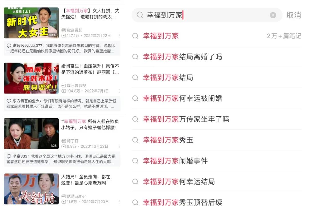 《幸福到万家》的农村剧属性,就没有限制它的传播渠道。无论是在下沉的抖音,以二次元、年轻为标签的B站,精致丽人钟爱的小红书,还是泛娱乐受众最常在的微博,都有着不俗讨论量。