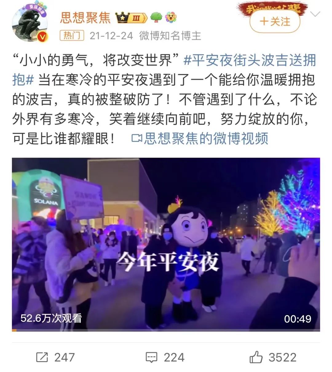 当#平安夜街头波吉送拥抱# #真人波吉长好高啊 等话题登上各个平台话题榜高位后,不少人才意识到这场为动画提升正向评价、加强治愈标签、拉升话题度的温暖体验,原来是一次营销。
