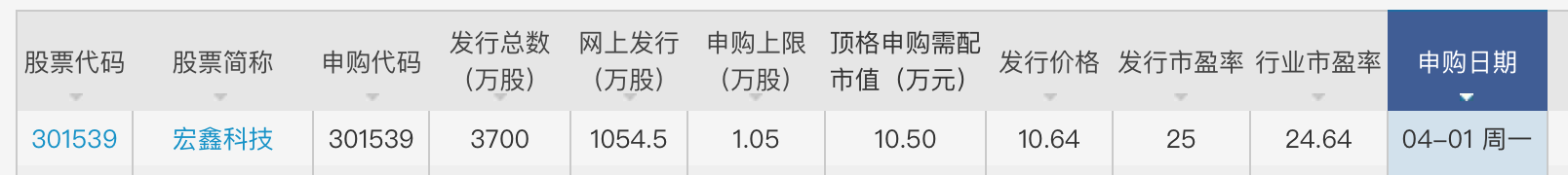 据悉,宏鑫科技的申购上限为1.05万股,发行价格10.64元,其发行市盈率和行业市盈率相仿,分别为25倍和24.64倍,申购时间为4月1日周一。