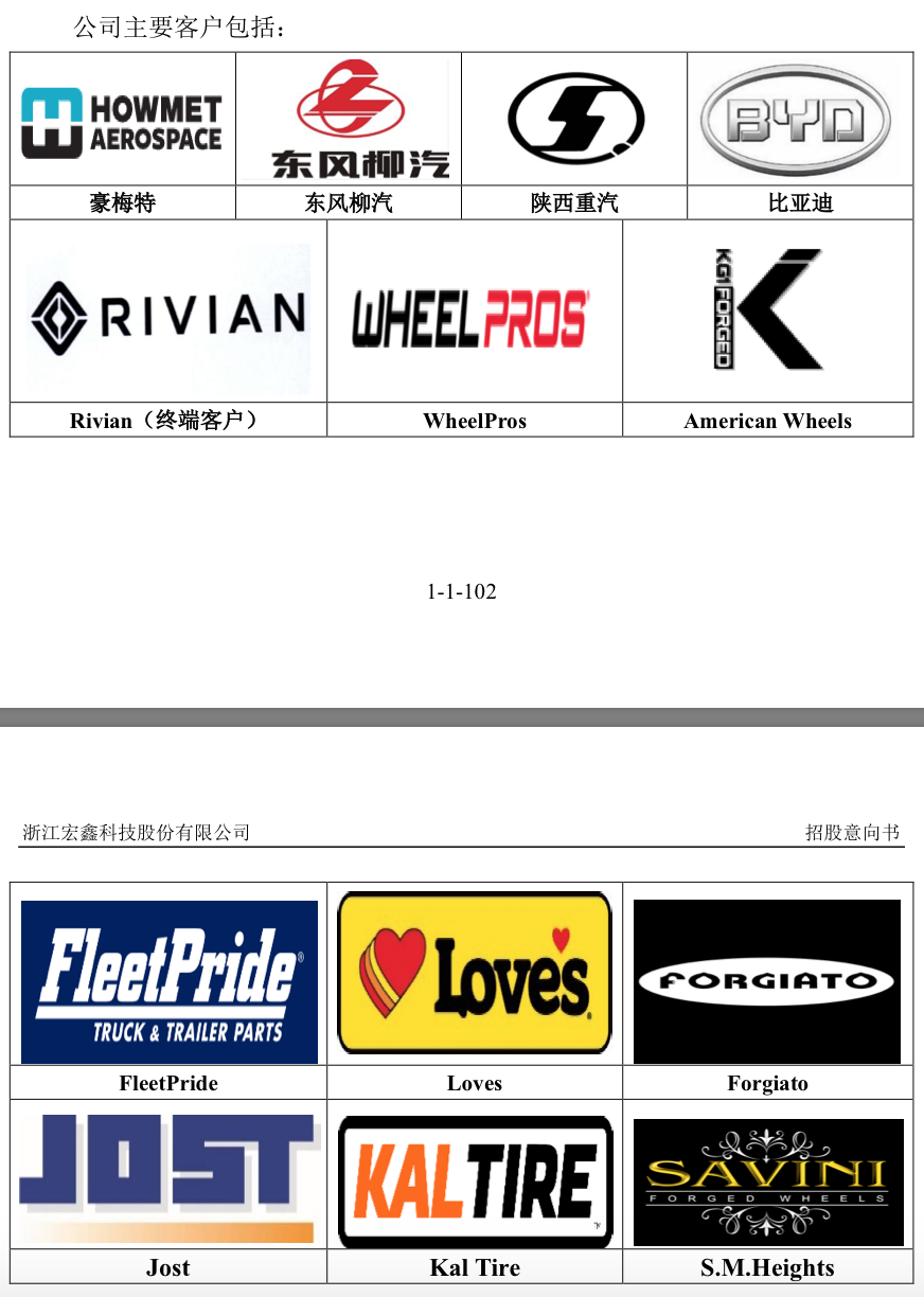 资料显示,宏鑫科技的主营业务为汽车锻造铝合金车轮的研发、设计、制造和销售,在我国商用车市场中,打破国外品牌对锻造铝合金车轮垄断的局面。宏鑫科技产品已直接配套豪梅特、东风柳汽、陕西重汽、比亚迪、中车时代等国内整车制造商或一级供应商。海外拓展方面,宏鑫科技目前已通过J. T. Morton、Superior分别配套美国新能源汽车制造商Rivian、Lucid,并进入Paccar(美国)的供应链。在汽车售后市场,公司也通过WheelPros供应给戴姆勒等整车制造商售后体系,并与WheelPros(美国)、American Wheels(美国)、FleetPride(美国)、Loves(美国)、Forgiato(美国)、Jost、Kal Tire(加拿大)、S.M.Heights(韩国)、Weds(日本)等品牌商保持业务合作。