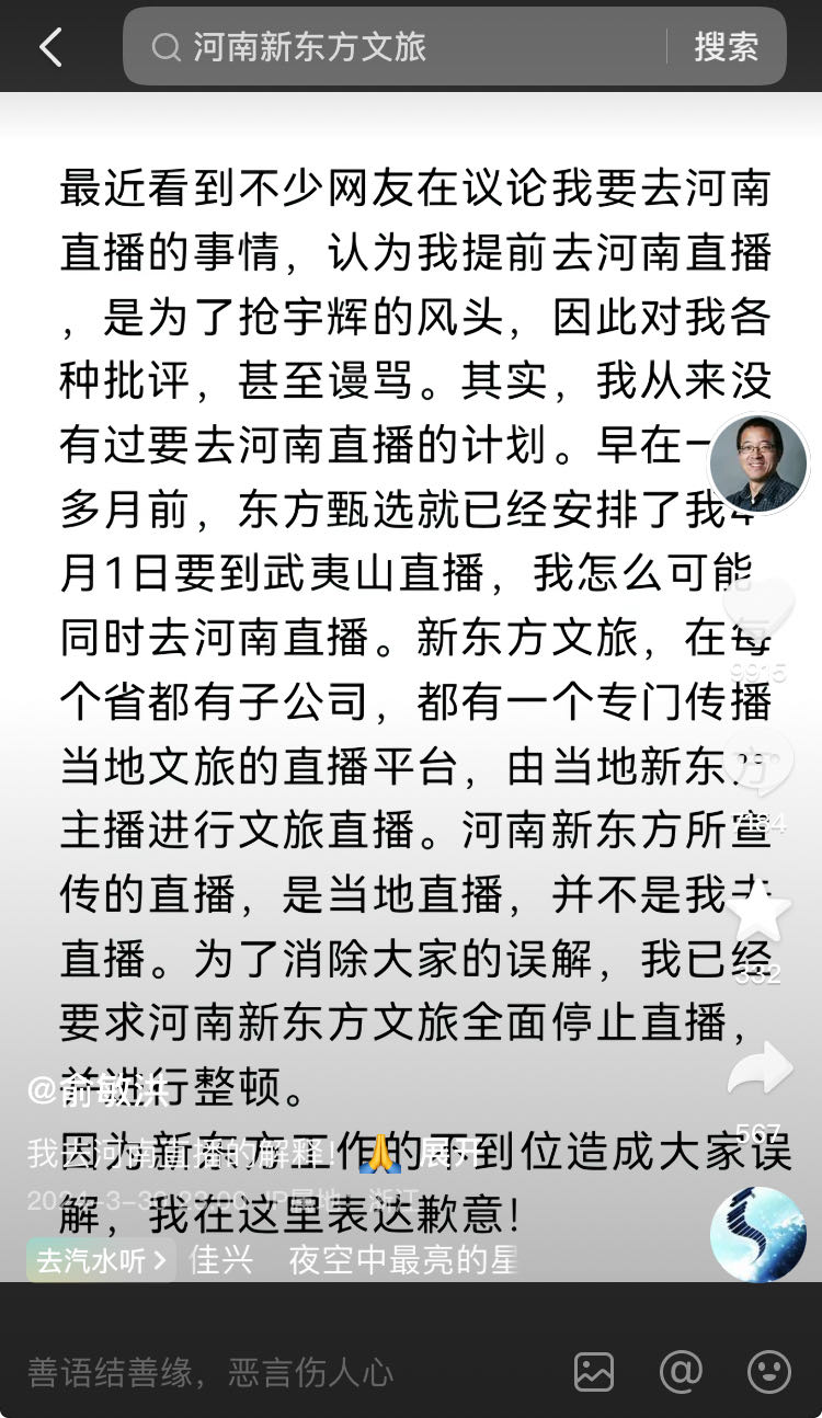 3月30日晚间,新东方创始人俞敏洪在其抖音账号发文,回应提前去河南直播是为抢董宇辉风头的传言。俞敏洪表示,从未有过要去河南直播的计划,“早在一个月前,东方甄选就已经安排了我4月1日要到武夷山直播”。俞敏洪称,新东方文旅在每个省都有子公司,都有一个专门传播当地文旅的直播平台,由当地新东方主播进行文旅直播。河南新东方所宣传的直播,是当地直播,并不是他去直播。为消除大家的误解,他已要求河南新东方文旅全面停止直播,并进行整顿。