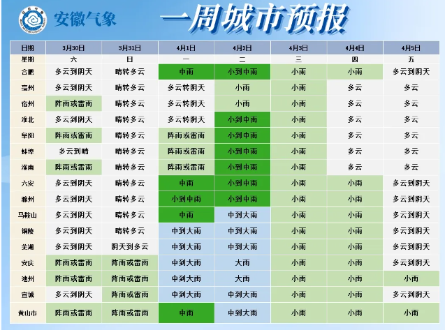 4月1日(周一):全省多云转阴天,沿淮淮河以南有阵雨或雷雨,部分地区中到大雨,局部暴雨。