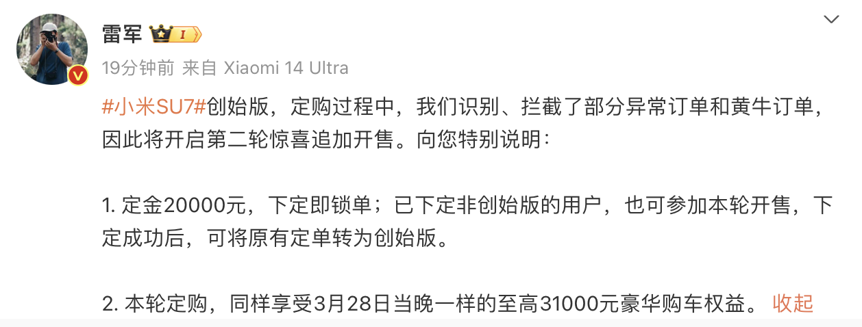 3月31日,小米集团董事长雷军发布微博称,创始版定购过程中,我们识别、拦截了部分异常订单和黄牛订单,因此将开启第二轮追加开售。本轮定购,同样享受3月28日当晚一样的至高31000元豪华购车权益。