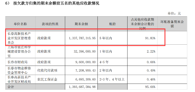 具体来看,2023年,房地产运营资金涉及53.3亿元。其中,地产业务存货36.5亿元,投资性房地产8984.23万元;预付款中,账龄超过1年的预付款2.16亿元,主要为房地产项目建设工程款;其他应收账款中,有13.37亿元政府款项,而在这其中,账龄超过三年的其他应收款就达8.75亿元;3906万元的货币资金因房地产行业监管被冻结。