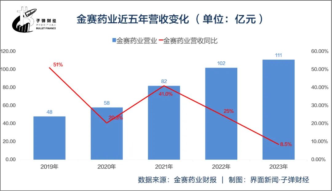 但从近五年来看,金赛药业的营收增速呈现下滑趋势。2023年,金赛药业实现营收111亿元,同比增长8.5%,增速较去年同期的25%下降了16.5个百分点。