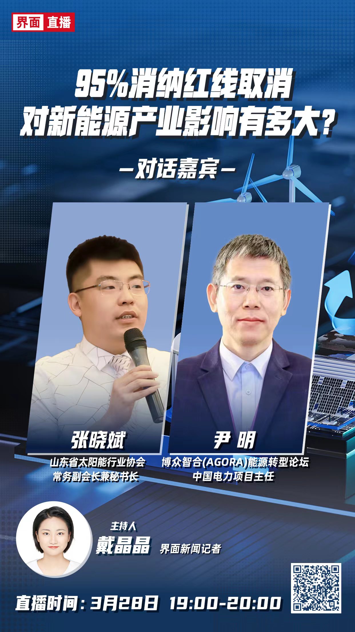 日前,界面新闻直播邀请两位嘉宾就近期风光消纳问题进行了深入探讨。他们分别是山东省太阳能行业协会常务副会长兼秘书长张晓斌,博众智合(Agora)能源转型论坛中国电力项目主任尹明。