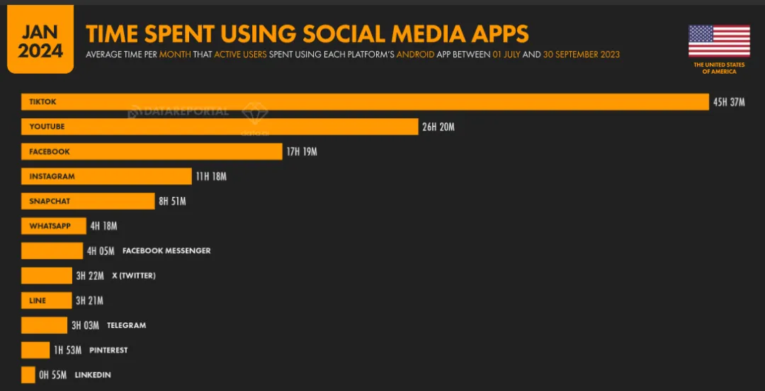 同时,在2023年7月1日至9月30日期间,TikTok活跃用户每月使用时长超45小时,位列第一,远超YouTube和FB。