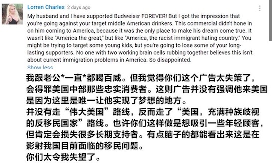 尽管这支广告的策划时间在去年10月,早在特朗普就任总统之前,并且百威强调它和如今美国的政治气候无关,但观众却不这么想。