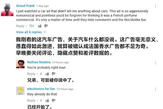 虽然两性平等的价值观宣传是品牌常见的营销思路,但奥迪这次的广告显然没那么讨喜。在上线5天后,它在Youtube上的播放量已经达到了620多万,5万多的差评数远比3万的点赞数高。根据社交媒体数据分析公司Networked Insights的调查显示,这支奥迪广告在社交网络上的评价,有25%都是负面的。