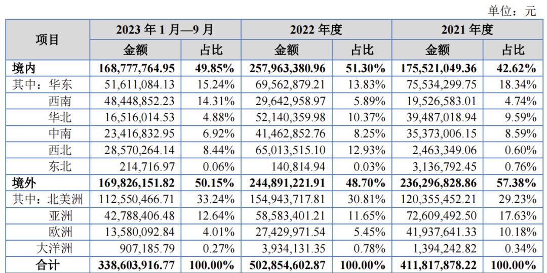 海外客户的收入分别为2.36亿元、2.45亿元和1.7亿元,占当期收入的57.38%、48.70%和50.15%,其海外客户主要分布在北美洲、亚洲及欧洲地区,其中北美洲占比最高。