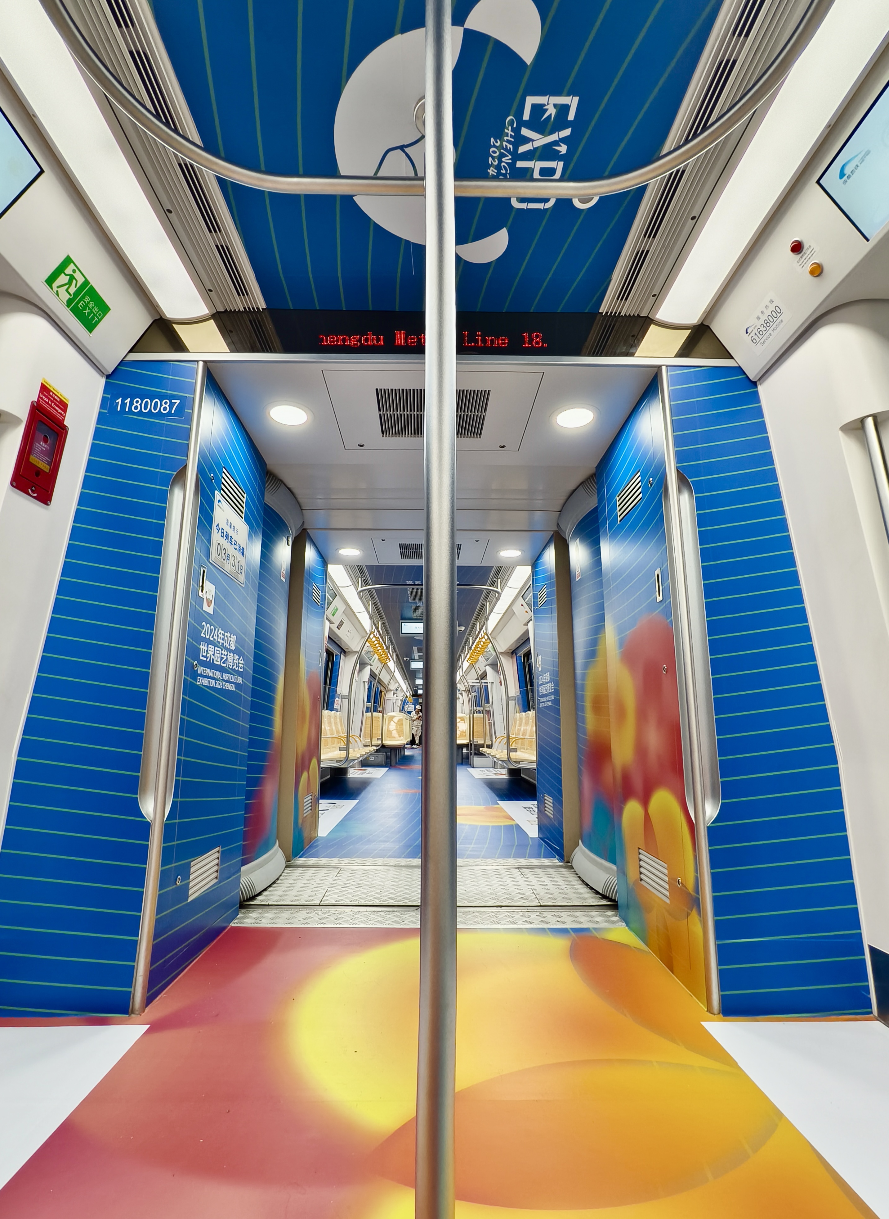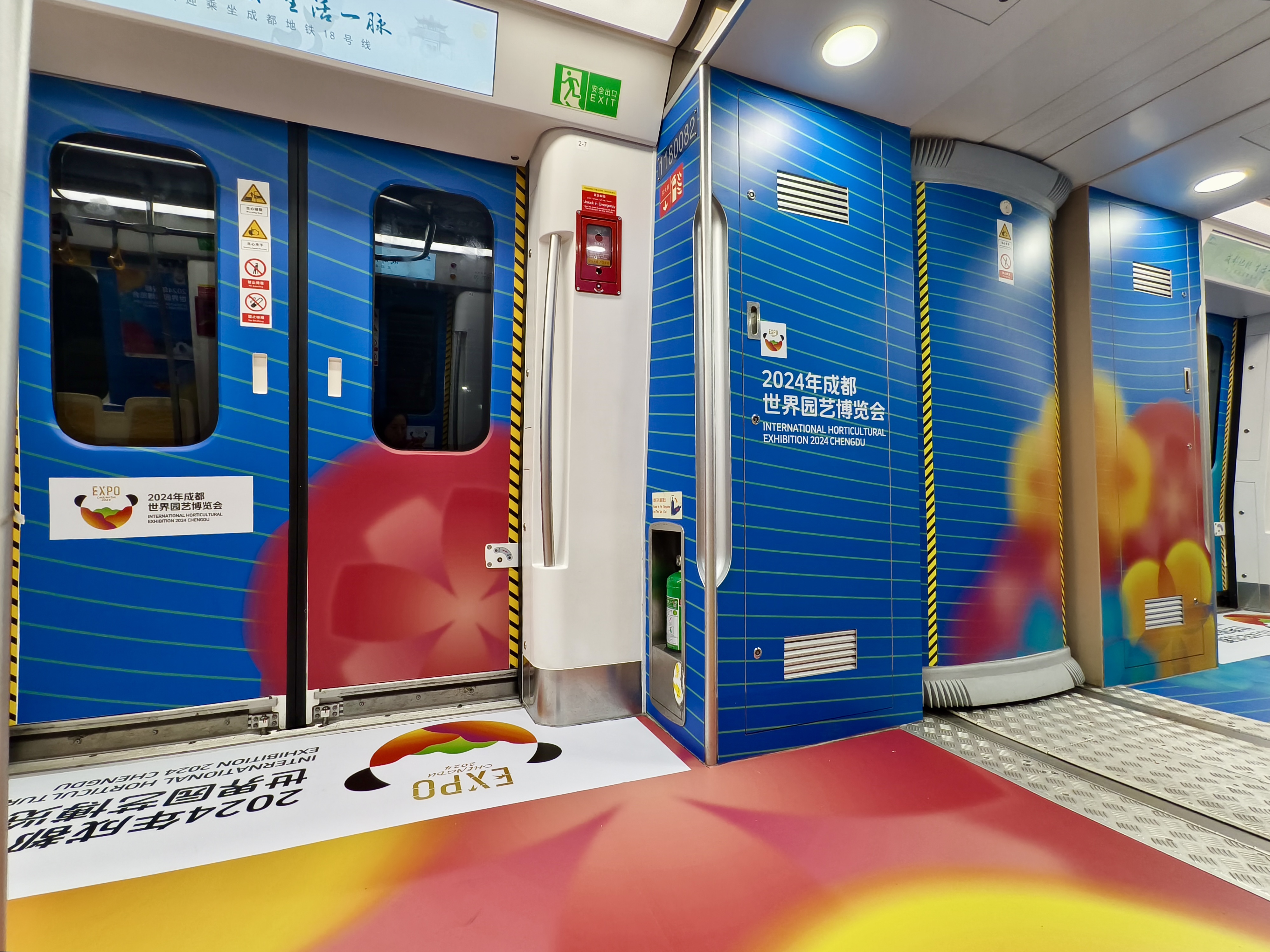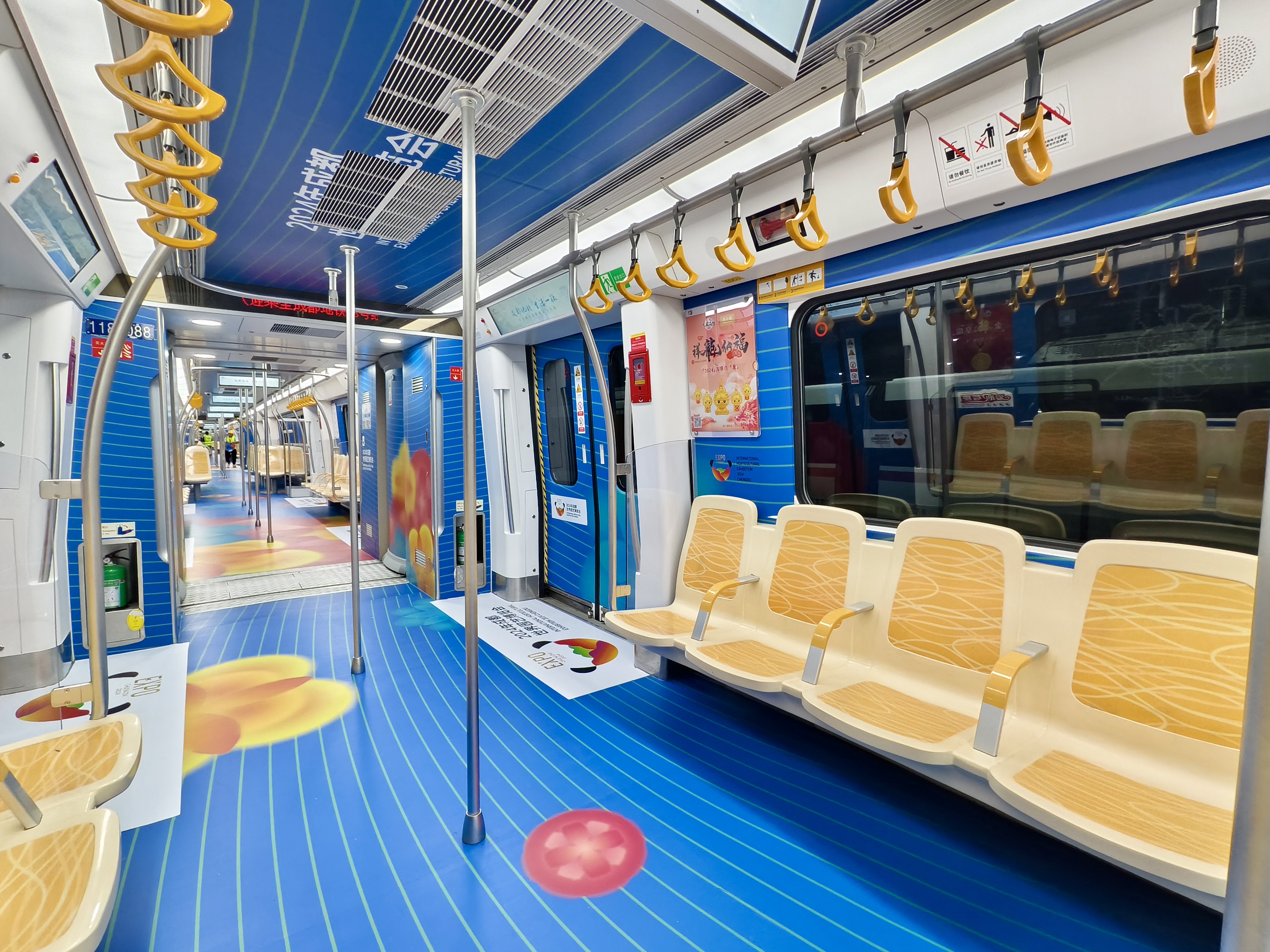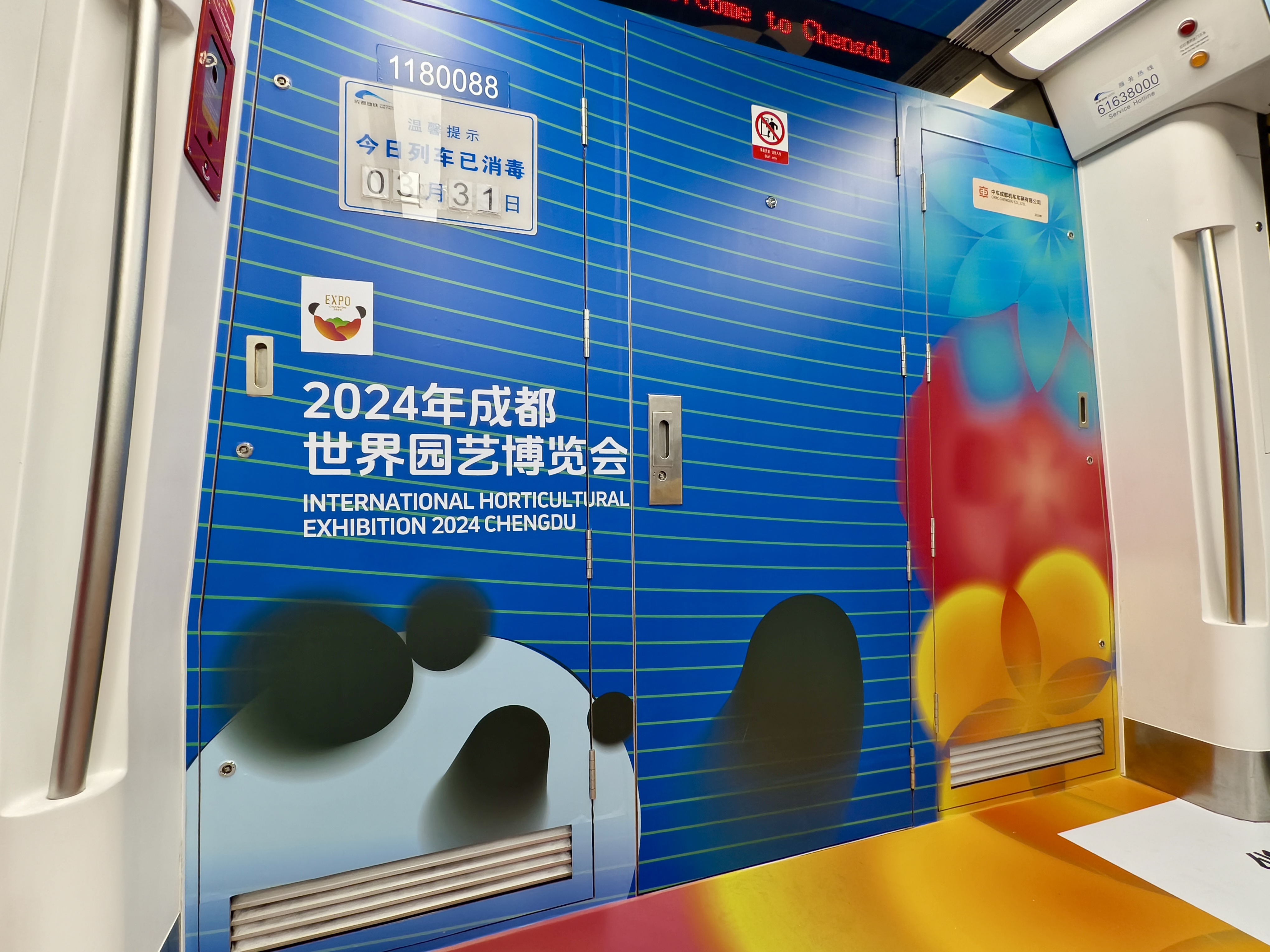 18号线“世园号”主题列车提炼了世园会“芙蓉花开”“国宝熊猫”两种主视觉元素进行定制化设计。以“芙蓉花开”展现花簇蓉城。车门主要呈现芙蓉花开的意境,一花一色、次第绽放,在黑白水墨之间让人眼前一亮,展现了世园会花团锦簇、绚丽多彩的自然景象。以“国宝熊猫”诠释特色成都。车身则突出了“熊猫”元素,使用水墨画的笔触勾勒出憨态可掬、生动可爱的国宝形象,代表着圆融柔和、开放友好的成都姿态。画面中的熊猫正在向前方招手,不远处各色芙蓉花影摇曳、渐变交叠,呈现熊猫嬉戏花丛的生动画面,勾勒出人与自然和谐共生的美好画卷。以“曲水流觞”彰显文化魅力。全车线条流畅、舒展,绵延的曲线让整体车厢呈现出曲水流觞的传统诗意和动静结合的文化意境,寓意着世园会在成都延展、融合,以生动之姿欢迎全球游客共赴世园之约,共享生态之美。
