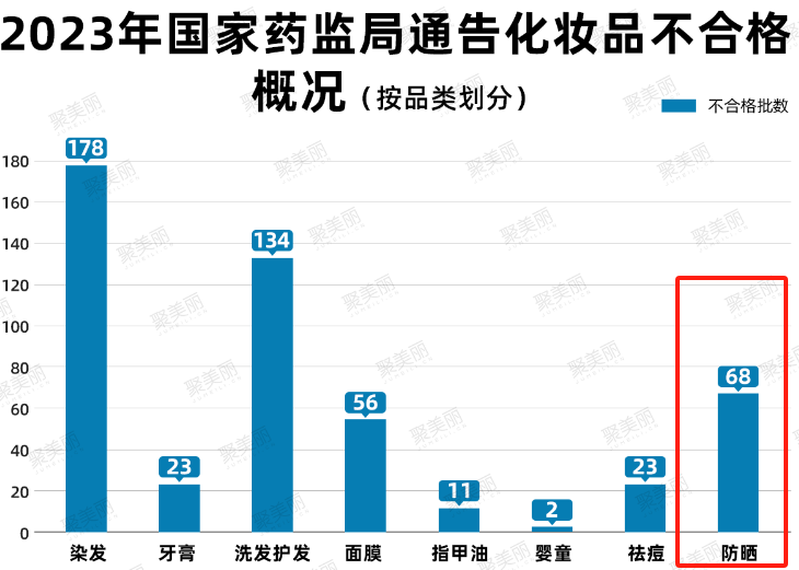 据聚美丽不完全统计,2023年国家药监局通报防晒产品不合格的产品共有68批次,其中防晒品类抽检不合格的原因主要为产品检出成分、产品标签与该产品注册资料载明的技术要求不一致。