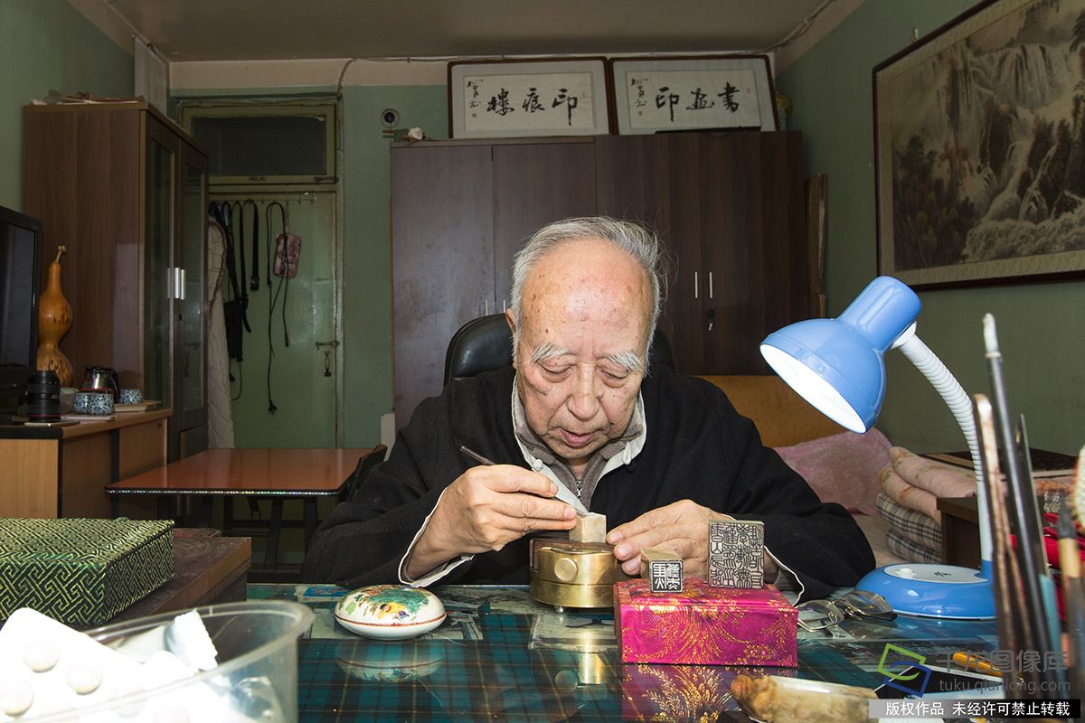 1月3日,梁增田老师在家中篆刻。