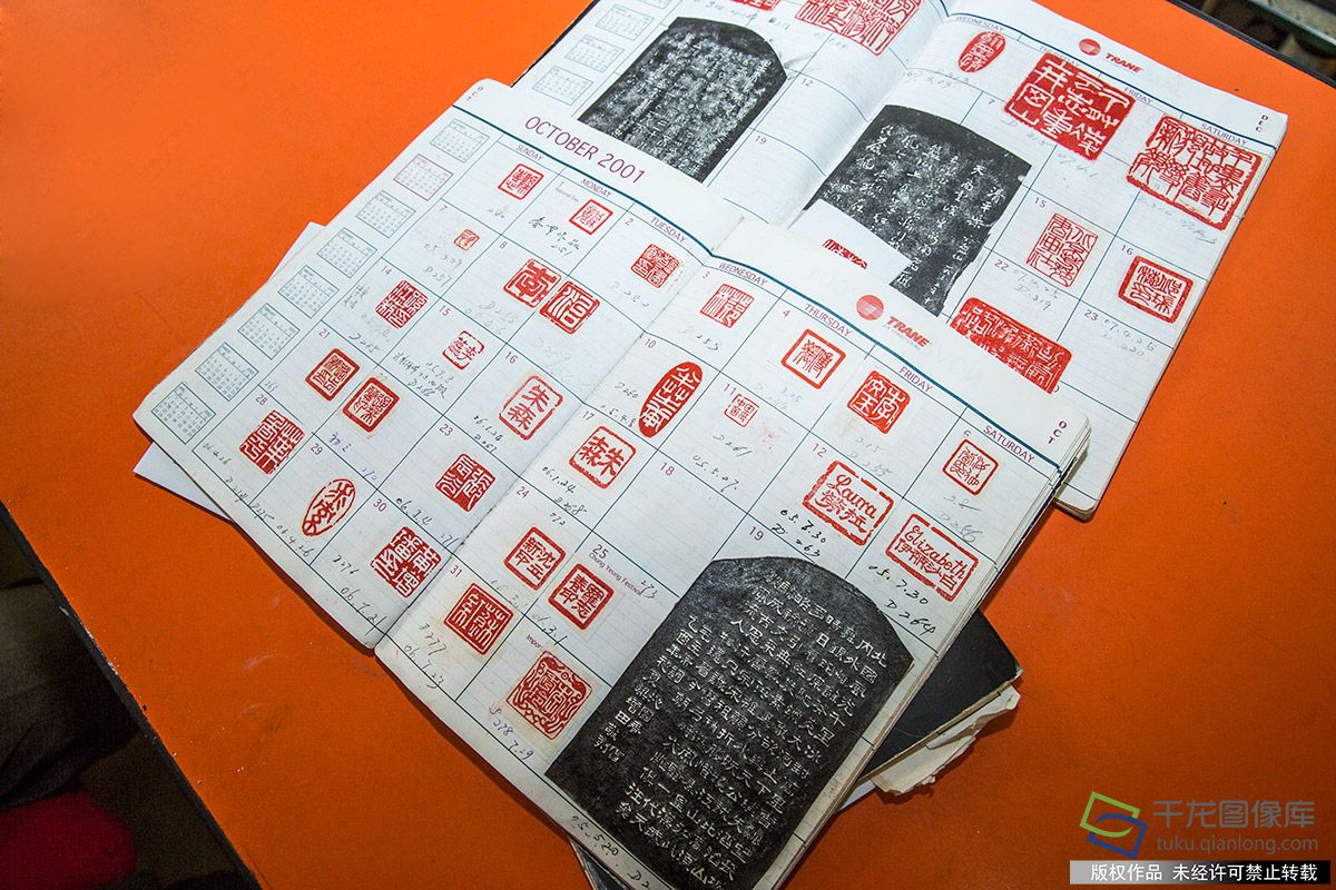 由于从小受长辈篆刻的耳濡目染,梁老师上手比较快,也克服了许多困难。说起学习篆刻之路,他老师小心翼翼地拿出一个本子,上面是所有印章的记录,每一方都清楚地记着制印的日期和内容。梁老师说:“什么事情都不是一高兴就开始做,要做好充分的准备,这跟我搞科研一样,要提前了解大量的资料。”