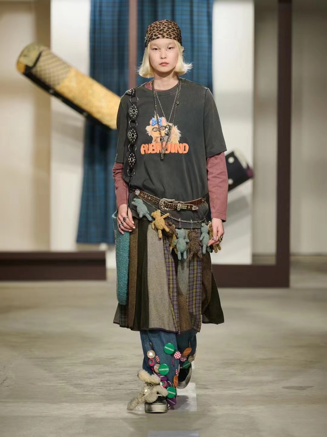 格纹元素被冲撞、分割,经过重组后赋予全新的生命力。金属链条、小熊玩偶等装饰在不同单品上或隐或现,象征着女孩内心世界中丰富的情感回忆。从小到大、从虚到实、从封闭到放飞,AUBRUINO通过巧妙的舞台设计和立体叠加的服装造型,为观众带来了一场关于少女长大、长大后依旧纯真的反转幻梦。