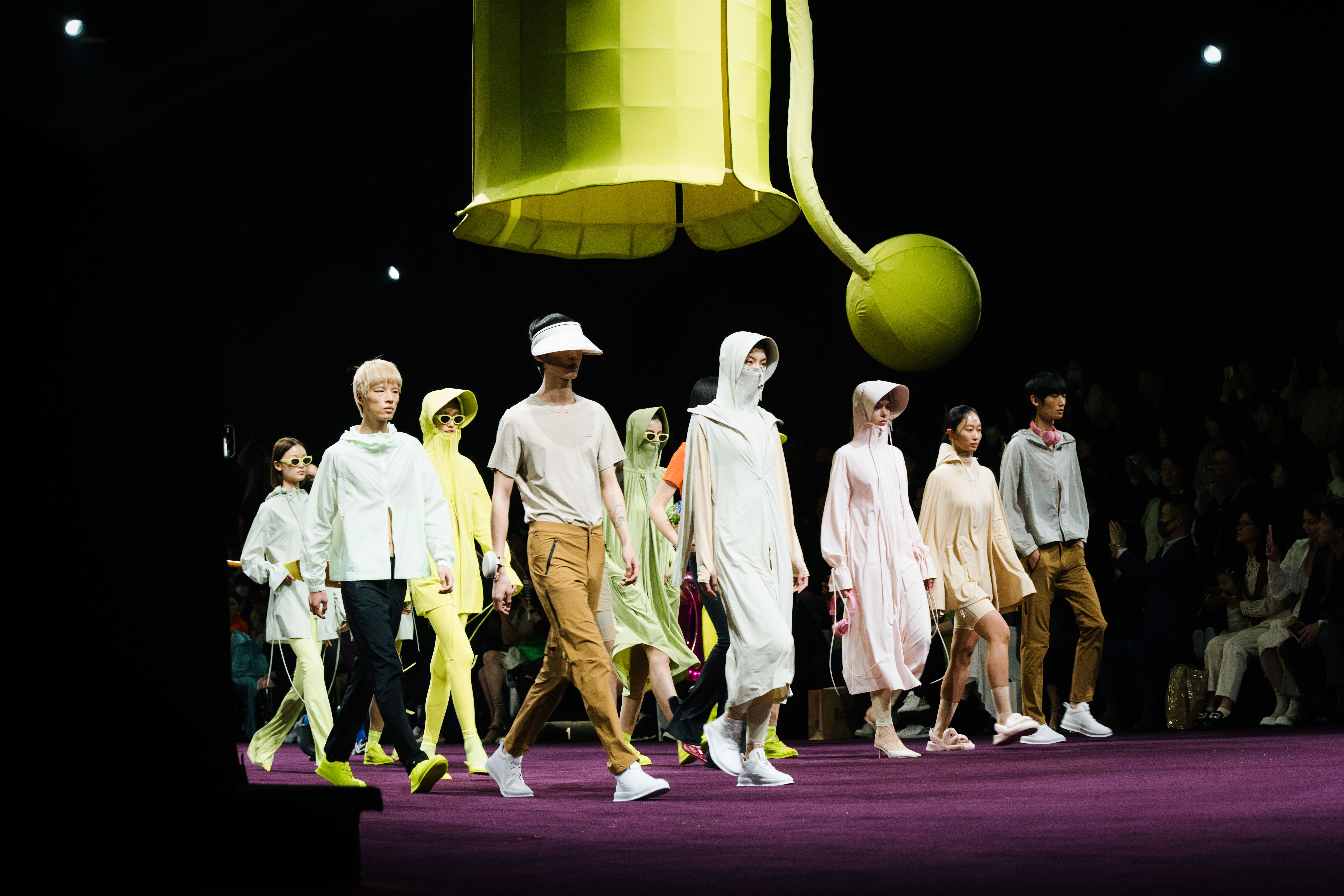 伴随着音乐的变换,大秀场景转换,MOUTION茉寻的全新春夏系列”万物心生”拉开帷幕。宽松剪裁、瞬凉面料、柔和色调组合,像是化作一股清流,让人仿佛置身于大自然中。