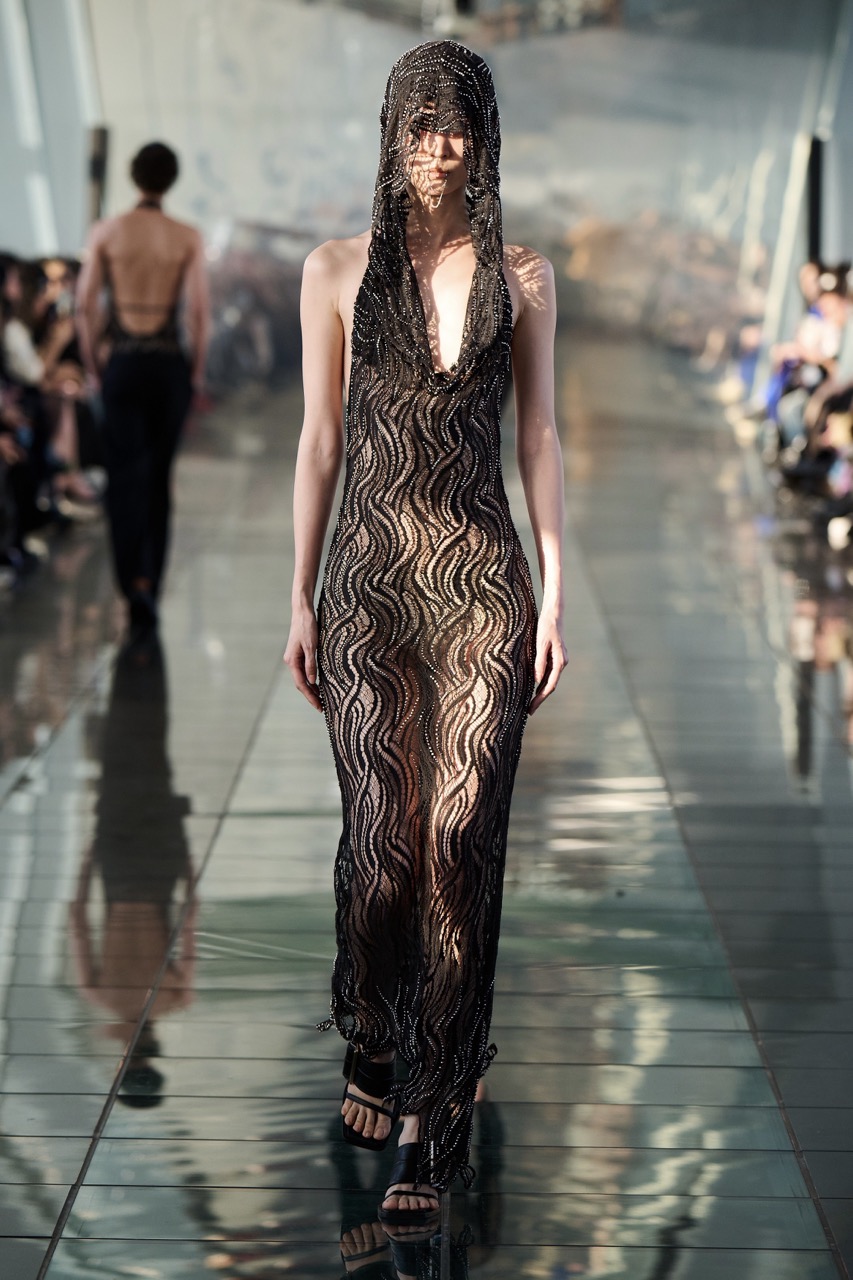 大秀中几件透视感十足的薄纱长裙十分吸睛。这些裙装暗藏锐利,繁密的珠链错综穿插其间,灵感正源于中世纪骑士的锁子甲。柔软的面料下隐藏着坚硬的力量,营造出一种脆弱与坚毅并存的独特气质。