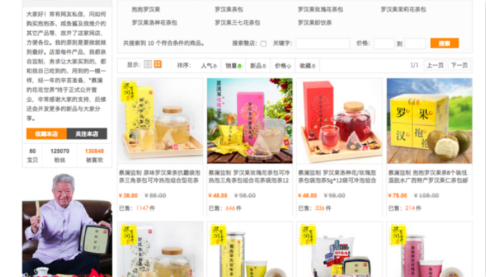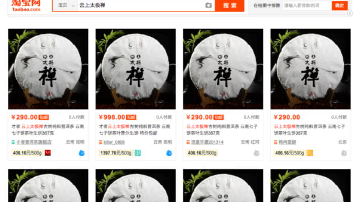 在淘宝上输入关键词,同一款茶品弹出几十条价格不一的产品链接,而唯一相同的就是零人付款的显示。或许这些茶的输出很大部分在于太极禅院内部,也或许是两位大咖的侧重点还是放在了太极文化上面。