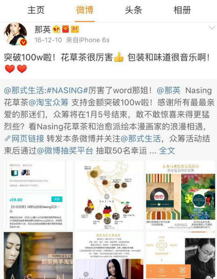 据传,由那英及其NASING团队调配创作的音乐花草茶,还成功安利了与她一起担任导师的周杰伦,而在此之前,这款音乐花草茶最吸睛之处还是在于其采用众筹的形式,短时间内就在京东、淘宝上分别完成50余万及100万的支持金额。为此,那英没少在各大媒体及自己微博上积极转发、大力宣传叫卖。