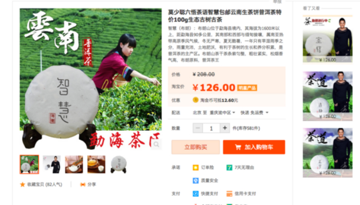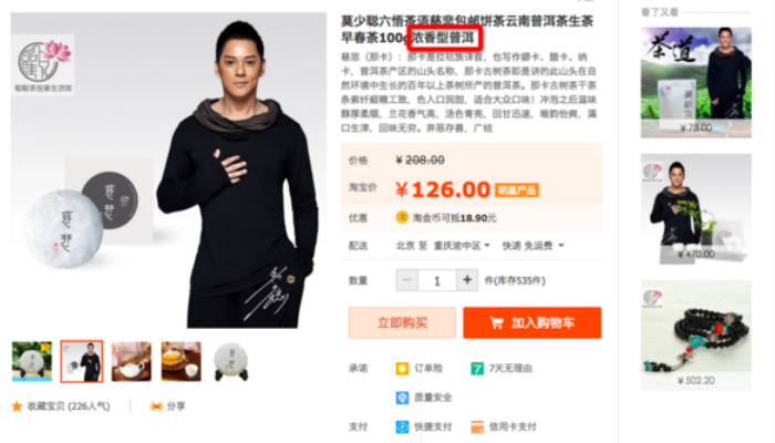 莫少聪在某宝所开的明星茶店,主要经营“六悟茶语”普洱茶、滇红。100g普洱茶饼的零售价为126元,也是销量平平。其中销量最好的一款茶品的介绍也让人有些疑惑,什么是浓香型普洱?