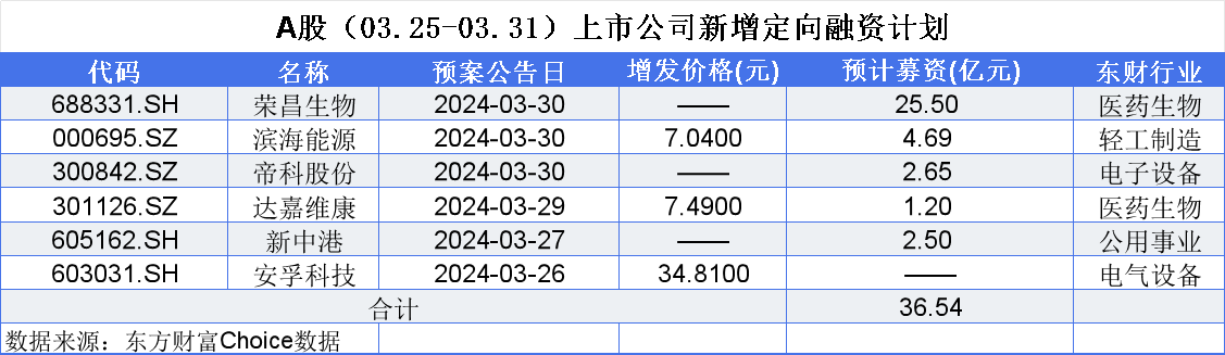 上周,A股有6家上市公司发布定增预案,预合计募资36.54亿元,其中荣昌生物(688331.SH)预募资25.5亿元。