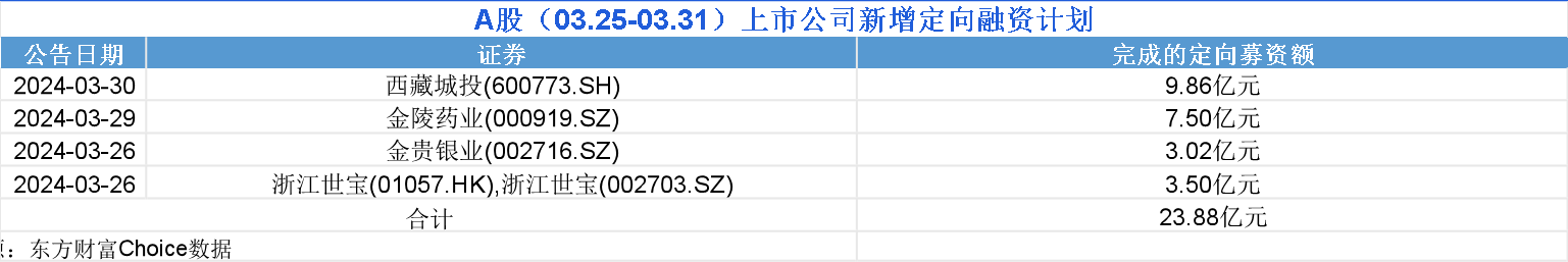 当周,4家上市公司完成募资,合计募资23.88亿元,其中西藏城投(600773.SH)完成募资9.86亿元。