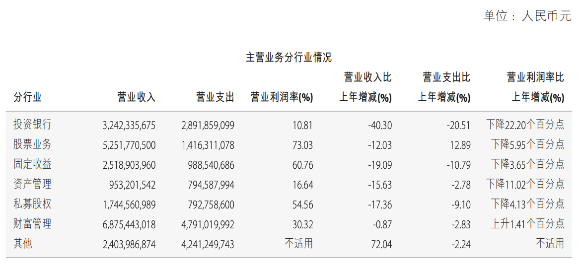在此影响下,中金公司各业务分部的营业收入相较于2022年均呈现不同程度的下降。