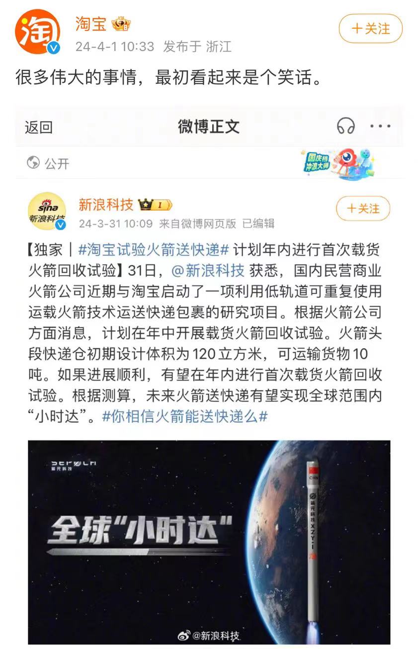 3月31日,新浪科技发文称,国内民营商业火箭公司近期与淘宝启动了一项利用低轨道可重复使用运载火箭技术运送快递包裹的研究项目。