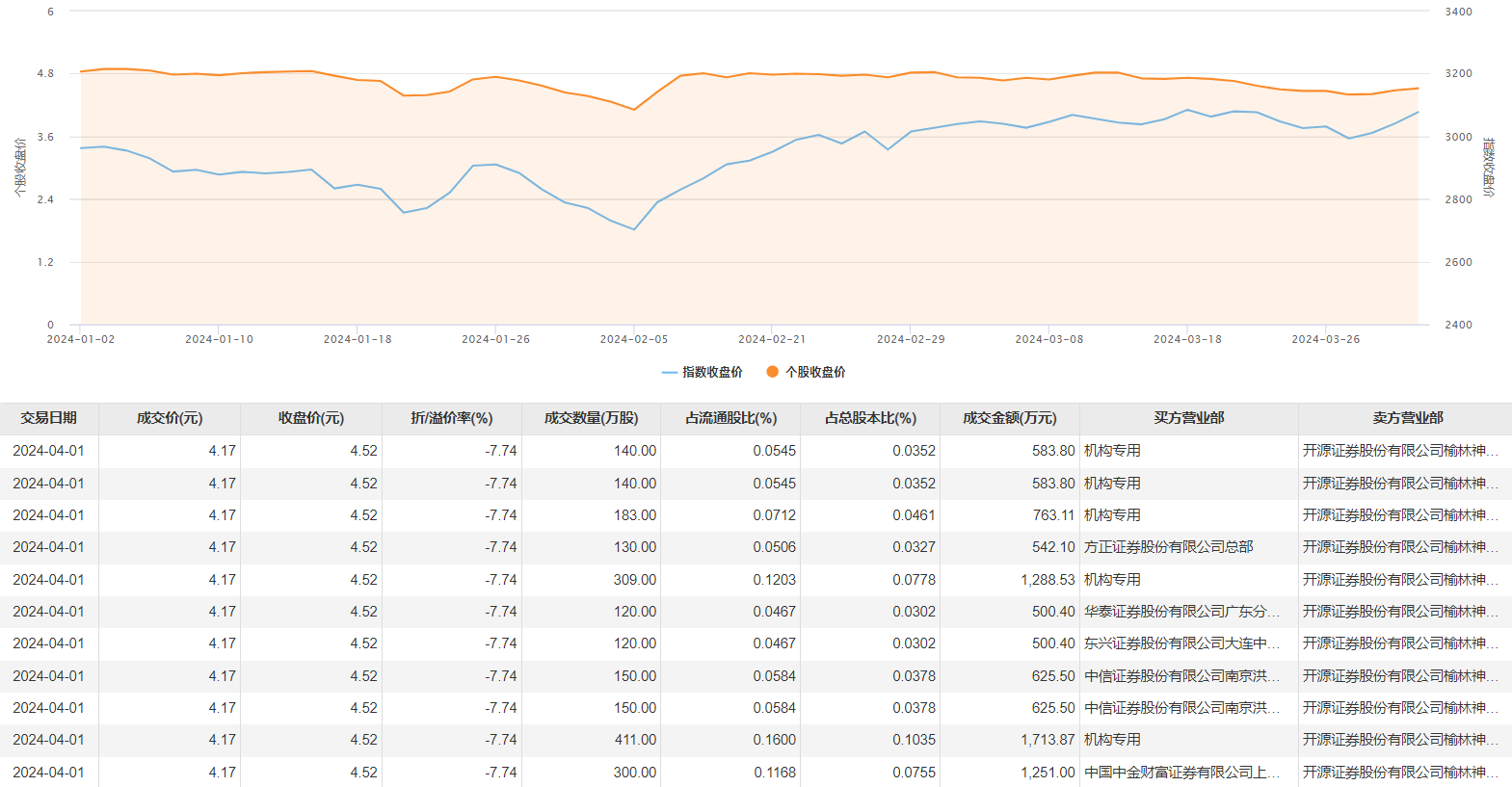 北元集团4月1日大宗交易成交2153万股,成交额8978.01万元,占当日总成交额的63.42%,成交价4.17元,较市场收盘价4.52元折价7.74%。