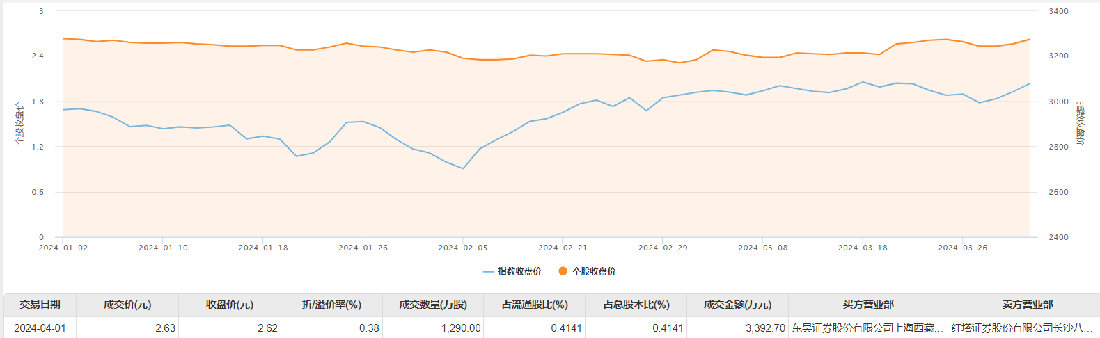 瀚叶股份4月1日大宗交易成交1290万股,成交额3392.7万元,占当日总成交额的33.86%,成交价2.63元,较市场收盘价2.62元溢价0.38%。