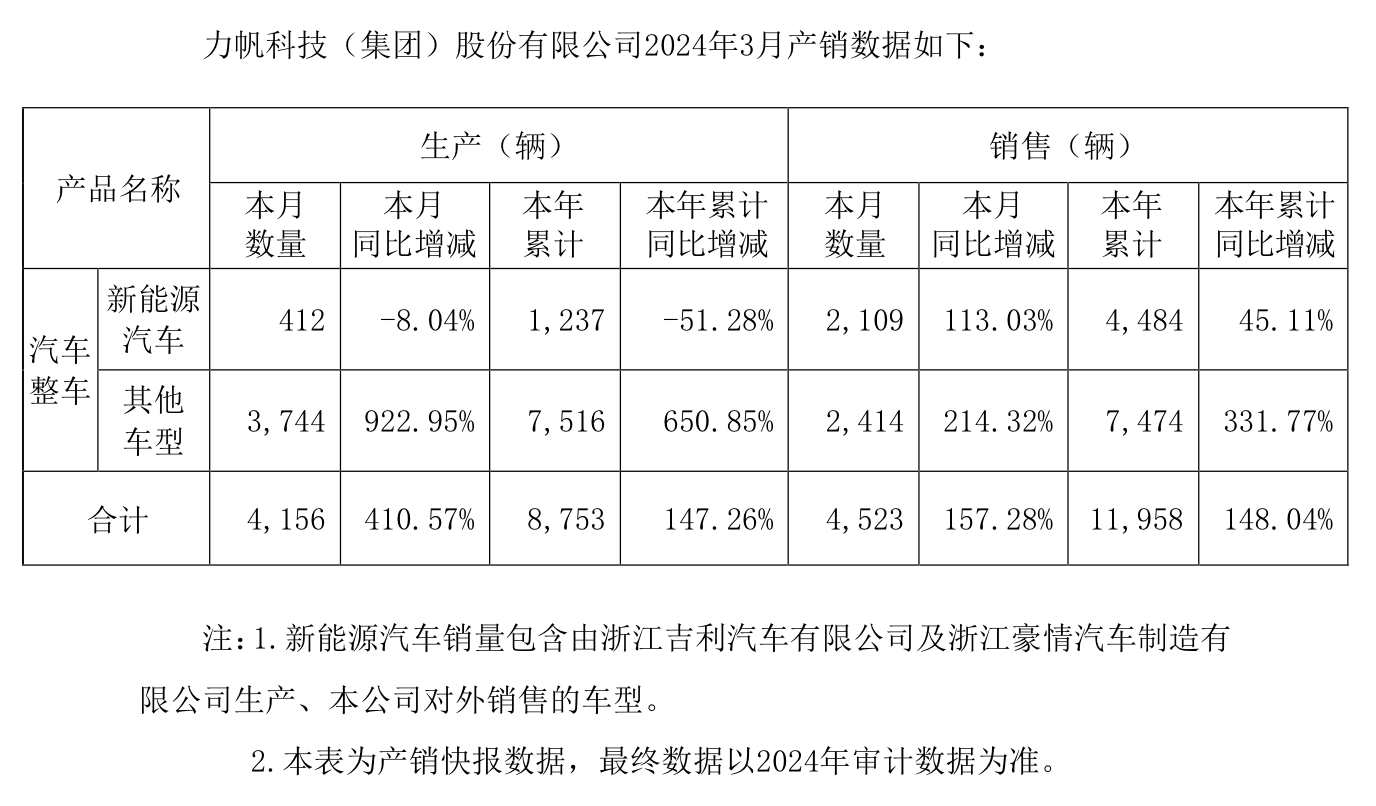 力帆科技(601777.SH)对2024年3月的产销情况也做了统计。据悉3月份汽车销量4523辆,同比增长157.28%;1-3月汽车销量11958辆,同比增长148.04%。这其中,3月新能源汽车销量2109辆,同比增长113.03%;1—3月新能源汽车销量4484辆,同比增长45.11%。新能源汽车销量包含由浙江吉利汽车有限公司及浙江豪情汽车制造有限公司生产、公司对外销售的车型。
