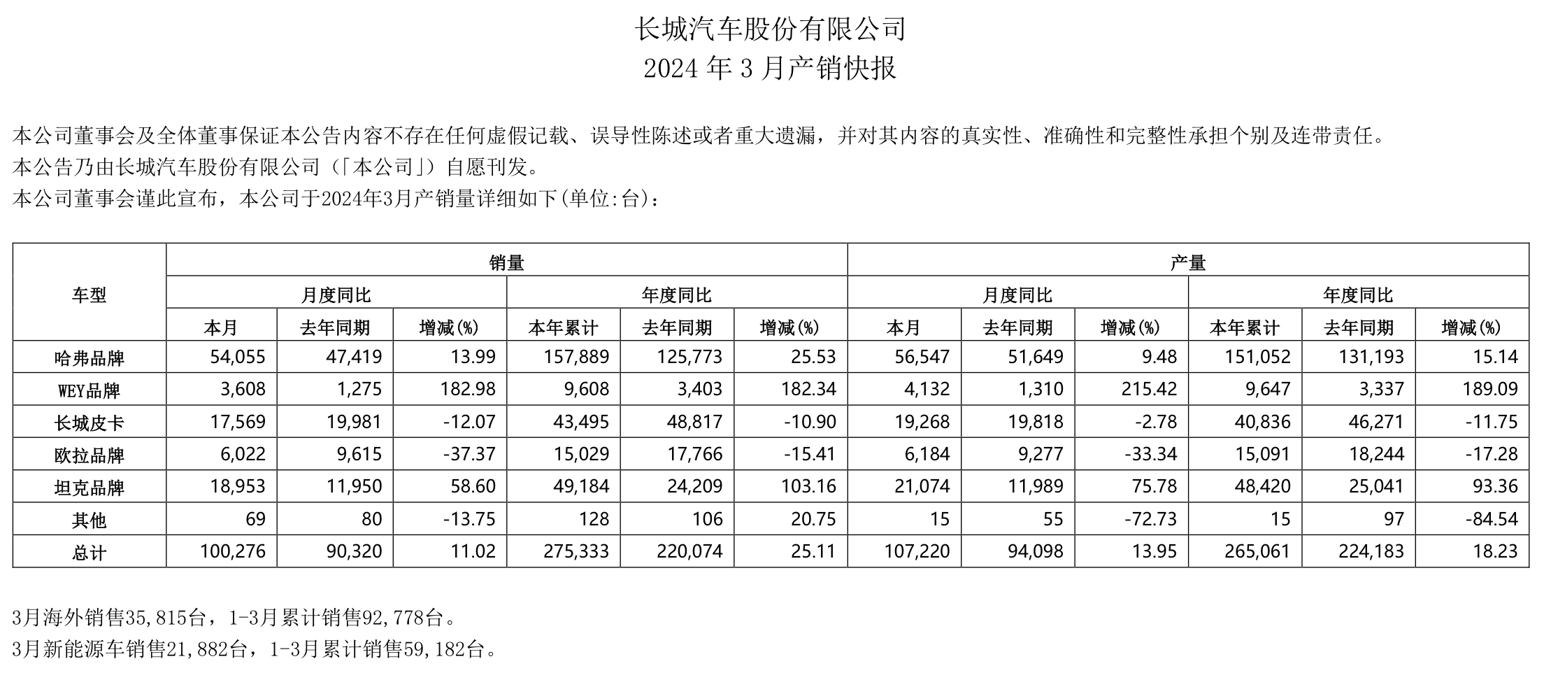 长城汽车(601633.SH)也有披露,公司3月销量100276台,同比增长11.02%;1-3月累计销量275333台,同比增长25.11%。其中,3月新能源车销售21882台,1-3月累计销售59182台。3月海外销售35815台,1-3月累计销售92778台。
