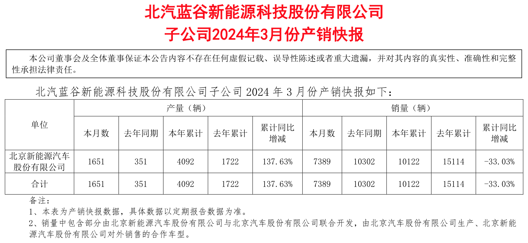 北汽蓝谷(600733.SH)公告,子公司北京新能源汽车股份有限公司在2024年3月份汽车销量7389辆,去年同期为10302辆;本年累计销量10122辆,去年同期累计15114辆,同比下滑33.03%。