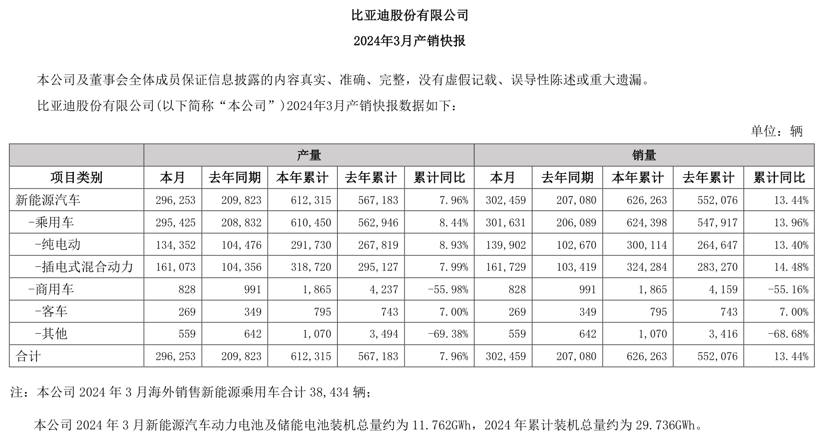 4月1日晚间,比亚迪(002594.SZ)公告,公司3月新能源汽车销量302459辆,上年同期销量207080辆;本年新能源汽车累计销量626263辆,累计同比上涨13.44%。比亚迪还强调2024年3月海外销售新能源乘用车合计38434辆。另外,2024年3月新能源汽车动力电池及储能电池装机总量约为11.762GWh,2024年累计装机总量约为29.736GWh。