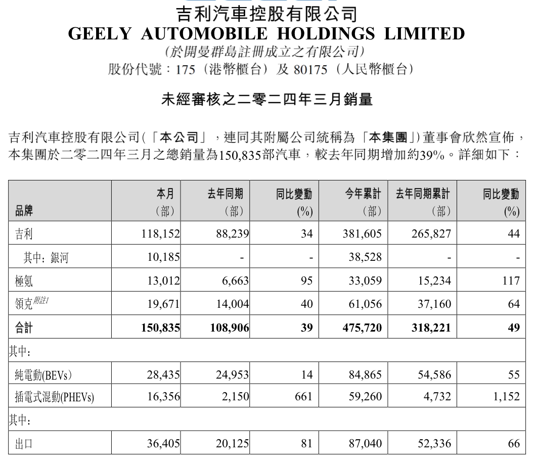 吉利汽车(00175.HK)公告显示,3月汽车销量15.08万辆,比上年同期增长39%。其中,纯电动车销量2.84万辆,同比增长14%;插电式混动1.64万辆,同比增长661%。吉利汽车今年累计销量汽车47.57万辆,同比变动49%。