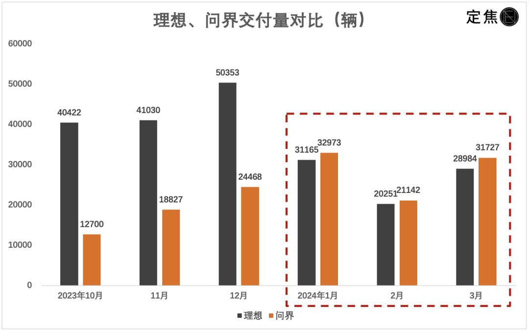 理想“摔跤”后,问界在3月继续领先理想,交付31727辆。这是问界第三次超过理想。