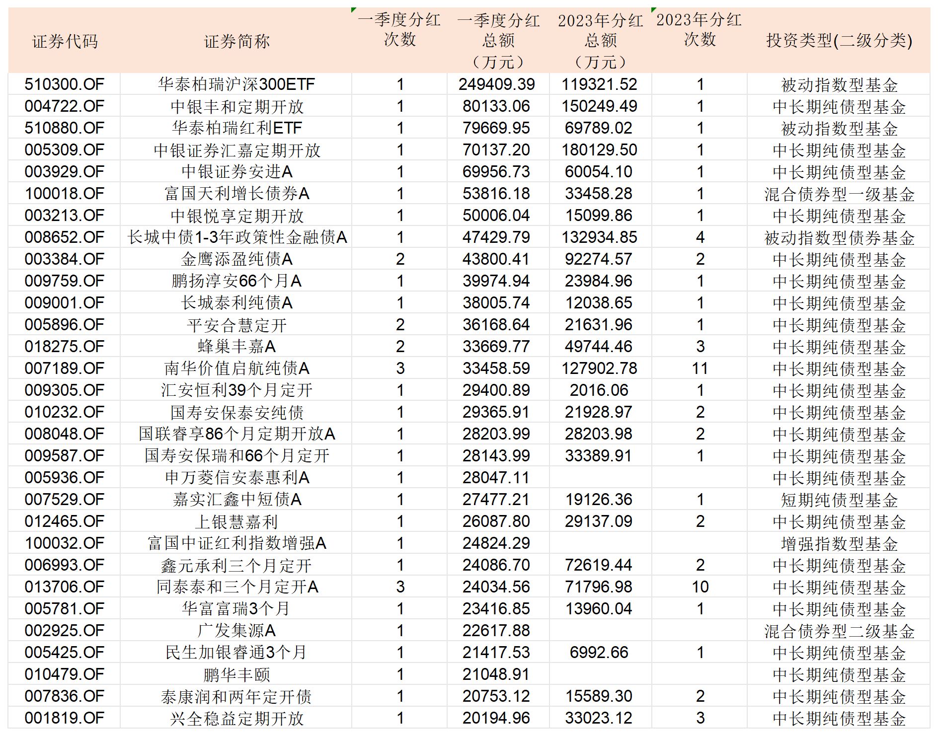 中银丰和定期开放、中银证券汇嘉定期开放、富国天利增长债券等基金的分红总额也排名居前。