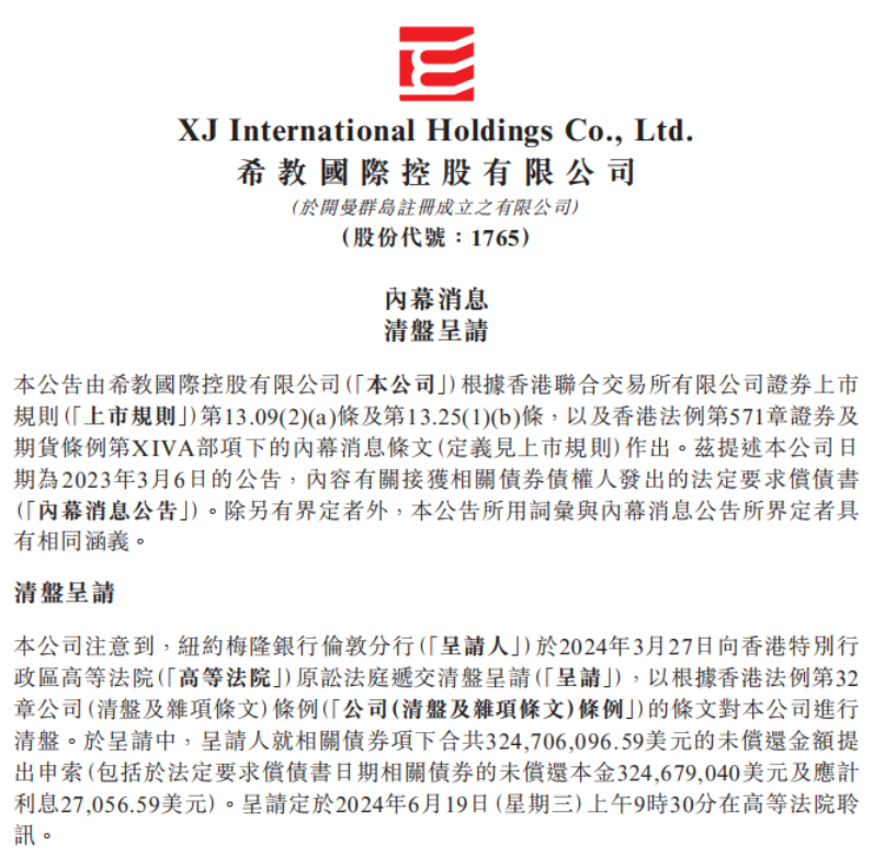 3月28日,希望教育发布公告,称纽约梅隆银行伦敦分行于3月27日向香港高等法院提交了清盘呈请,呈请定于6月19日在高等法院聆讯。