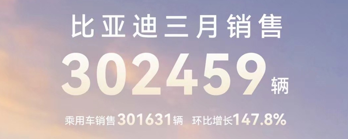 传统品牌发布销量数据的速度偏慢,但也有比亚迪、广汽埃安、吉利、五菱、上汽大众等品牌快速跟进。其中,比亚迪依然是新能源销量的“领头羊”,在3月份累计售出了301631辆新能源乘用车,环比增长147.8%。